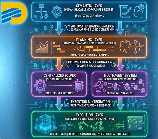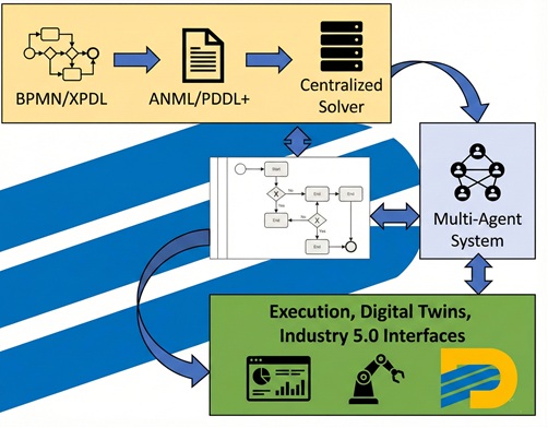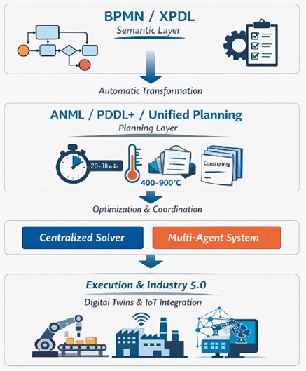 The proposed approach introduces a layered modeling framework that separates business-level process semantics from machine-solvable scheduling representations. High-level workflows and recipes are expressed using BPMN/XPDL, while temporal planning and scheduling models are automatically compiled into ANML, PDDL+, or Unified Planning representations.